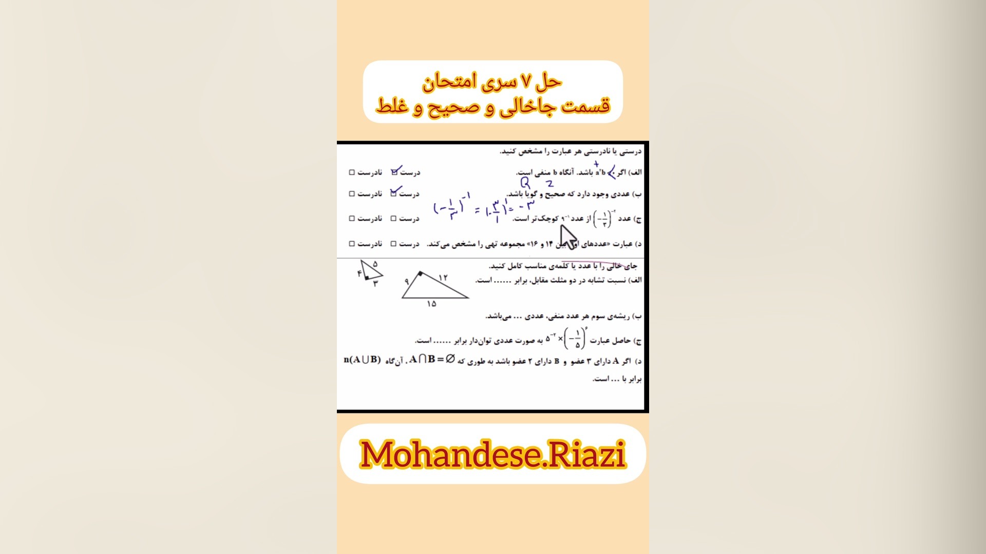 حل 7سری نمونه سوال صحیح و غلط و جاخالی ریاضی نهم