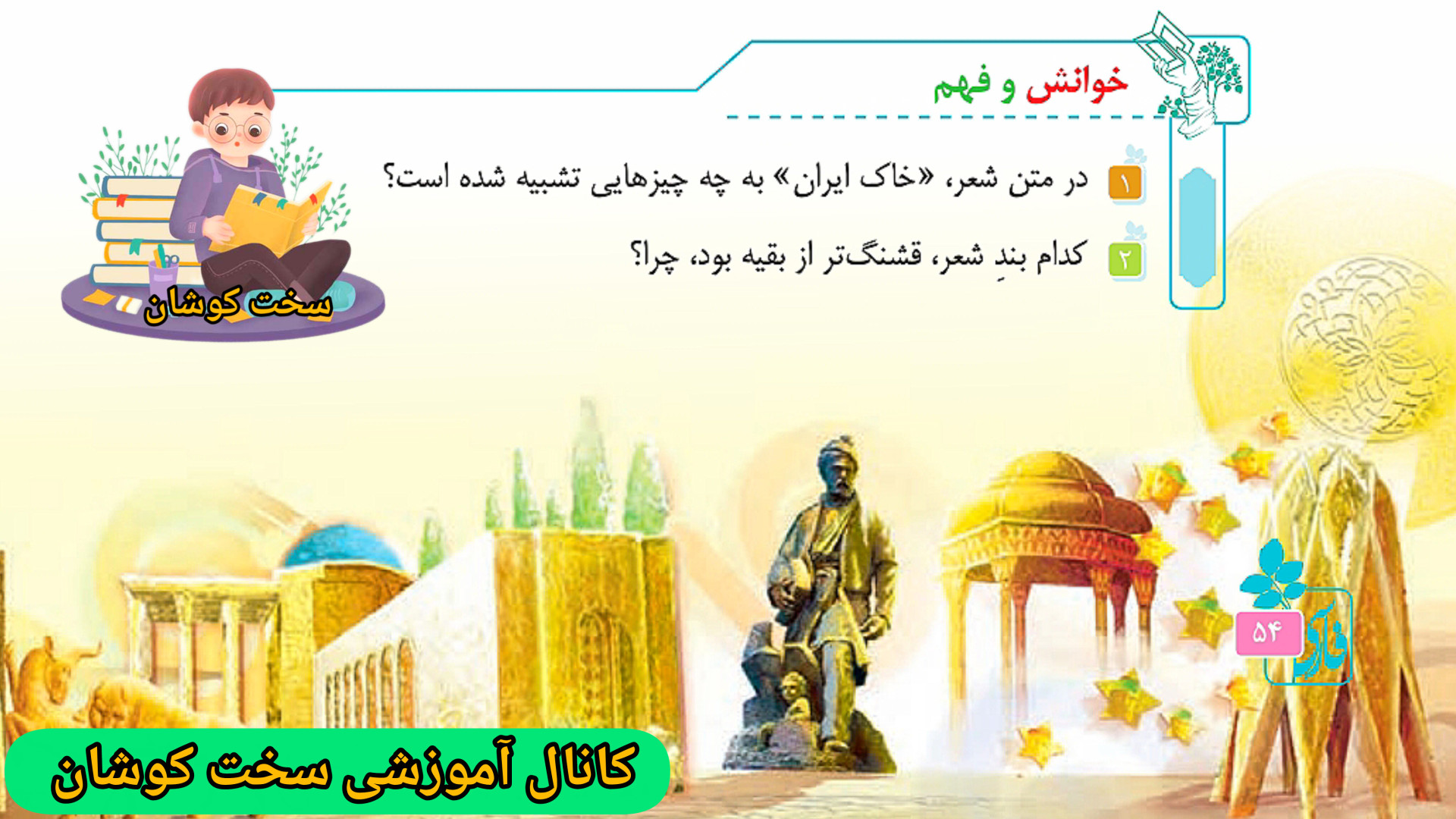 سلام دانش آموزان عزیز در این ویدئو با جواب صفحه ۵۴ فارسی پنجم دبستان در خدمتتون هستم. کانال آموزشی سخت کوشان