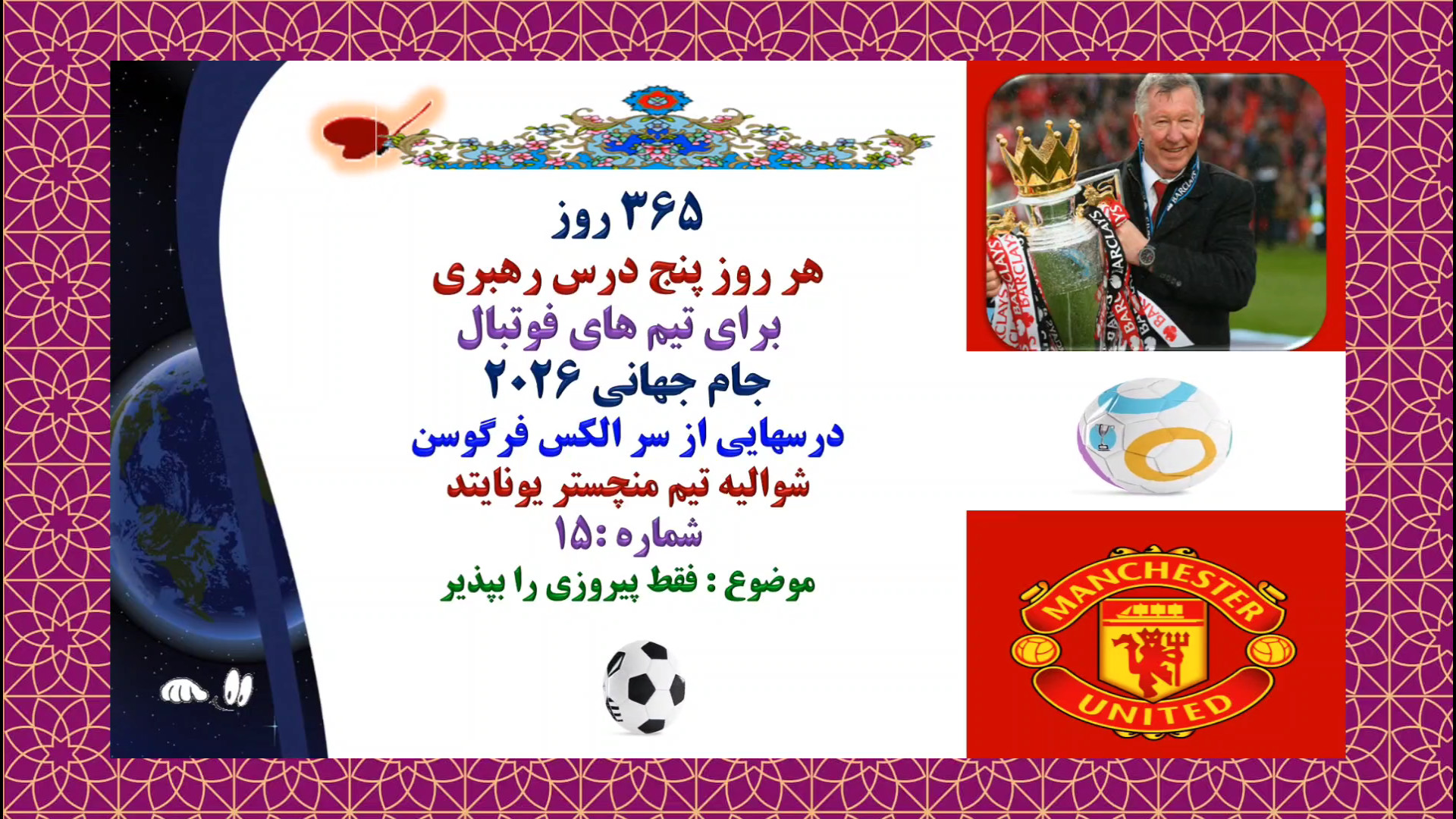 365 روز هر روز پنج درس رهبری برای تیم های فوتبال جام جهانی 2026 درسهایی از سر الکس فرگوسن شوالیه تیم منچستر یونایتد شماره :15 موضوع : فقط پیروزی را بپذیر