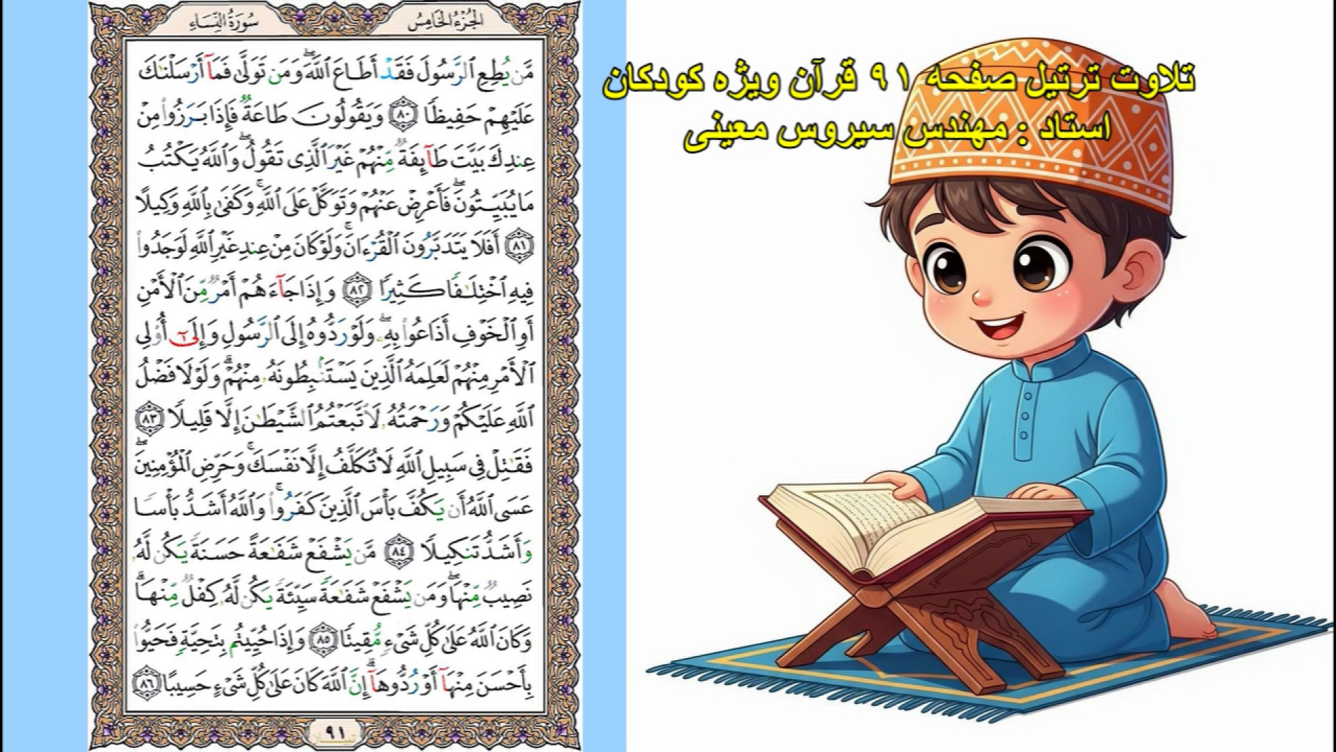 ترتیل صفحه 91 قرآن (با صفحه قرآن) ویژه کودکان- استاد مهندس سیروس معینی