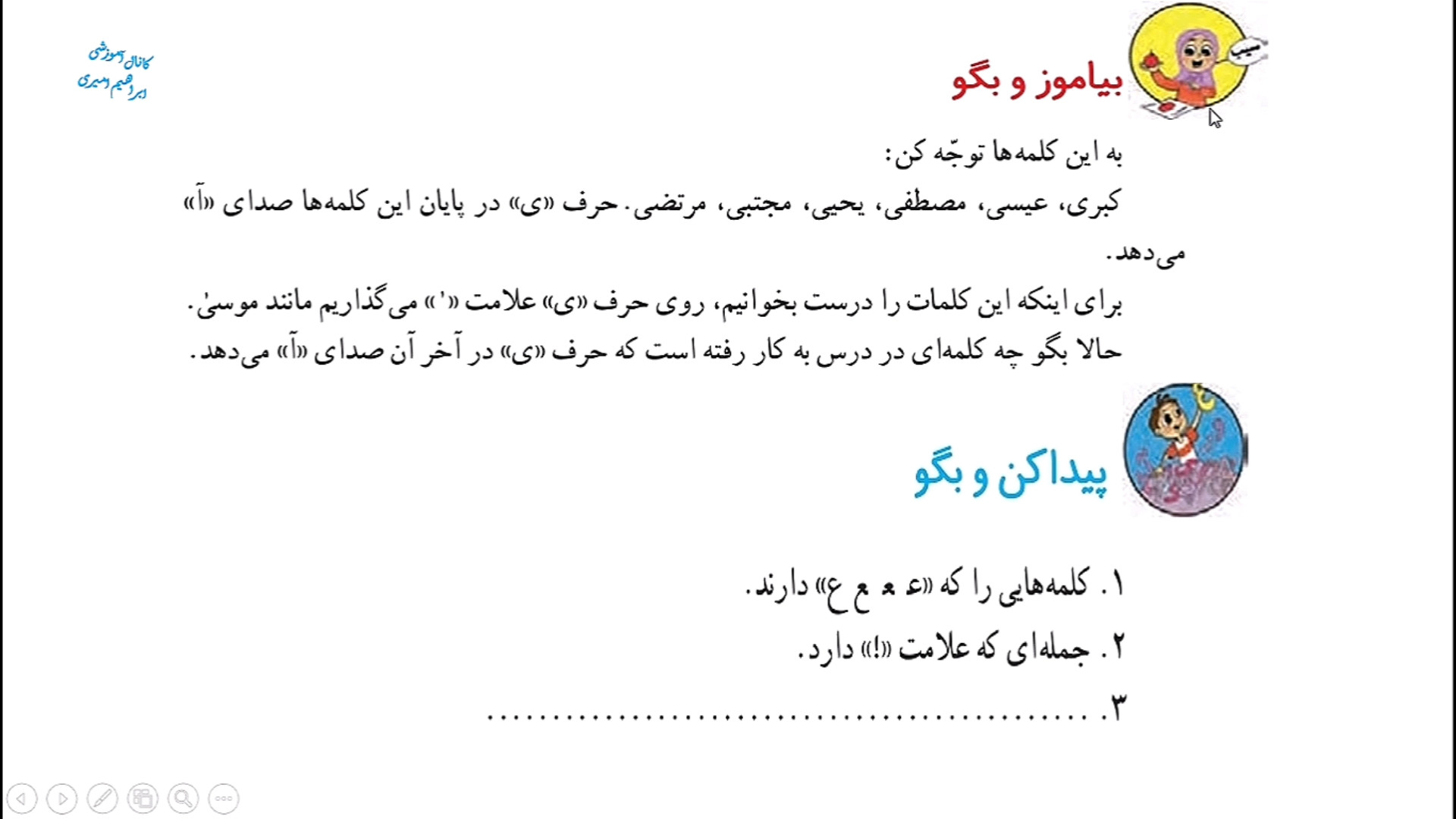 با آموزش و جواب صفحه ۵۳ فارسی دوم ابتدایی همراه شما هستم بخش بیاموز و بگو پیدا کن و بگو بازی و نمایش