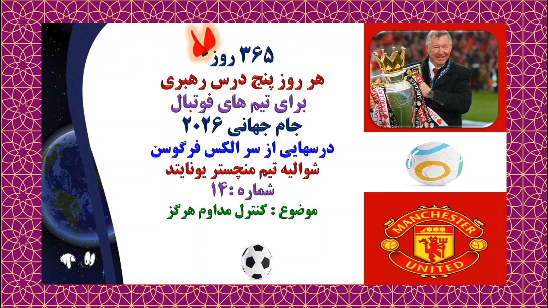 365 روز هر روز پنج درس رهبری برای تیم های فوتبال جام جهانی 2026 درسهایی از سر الکس فرگوسن شوالیه تیم منچستر یونایتد شماره :14 موضوع : کنترل مداوم هرگز