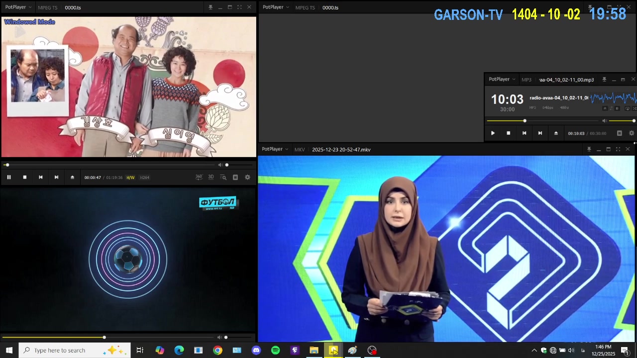 پخش همزمان اخبار از شبکه دو همراه با برنامه از رادیو در کنار گزارش ورزشی از تلویزیون تاجیکستان و خبر از شبکه سه همراه با سریال از شبکه تماشا که در آن روز پخش شده است