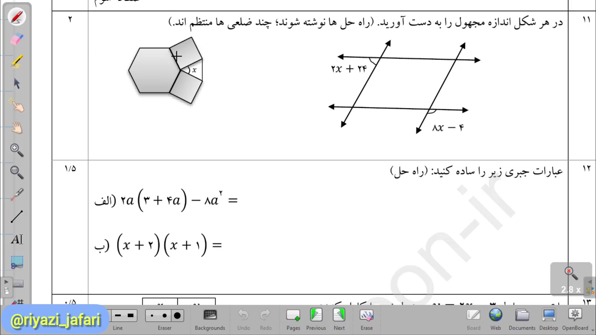 در این ویدئو توضیحاتی در مورد خواص خطوط موازی و مورب ،زوایا در چند ضلعی ها و همچنین ساده سازی عبارت های جبری آورده شده است.
