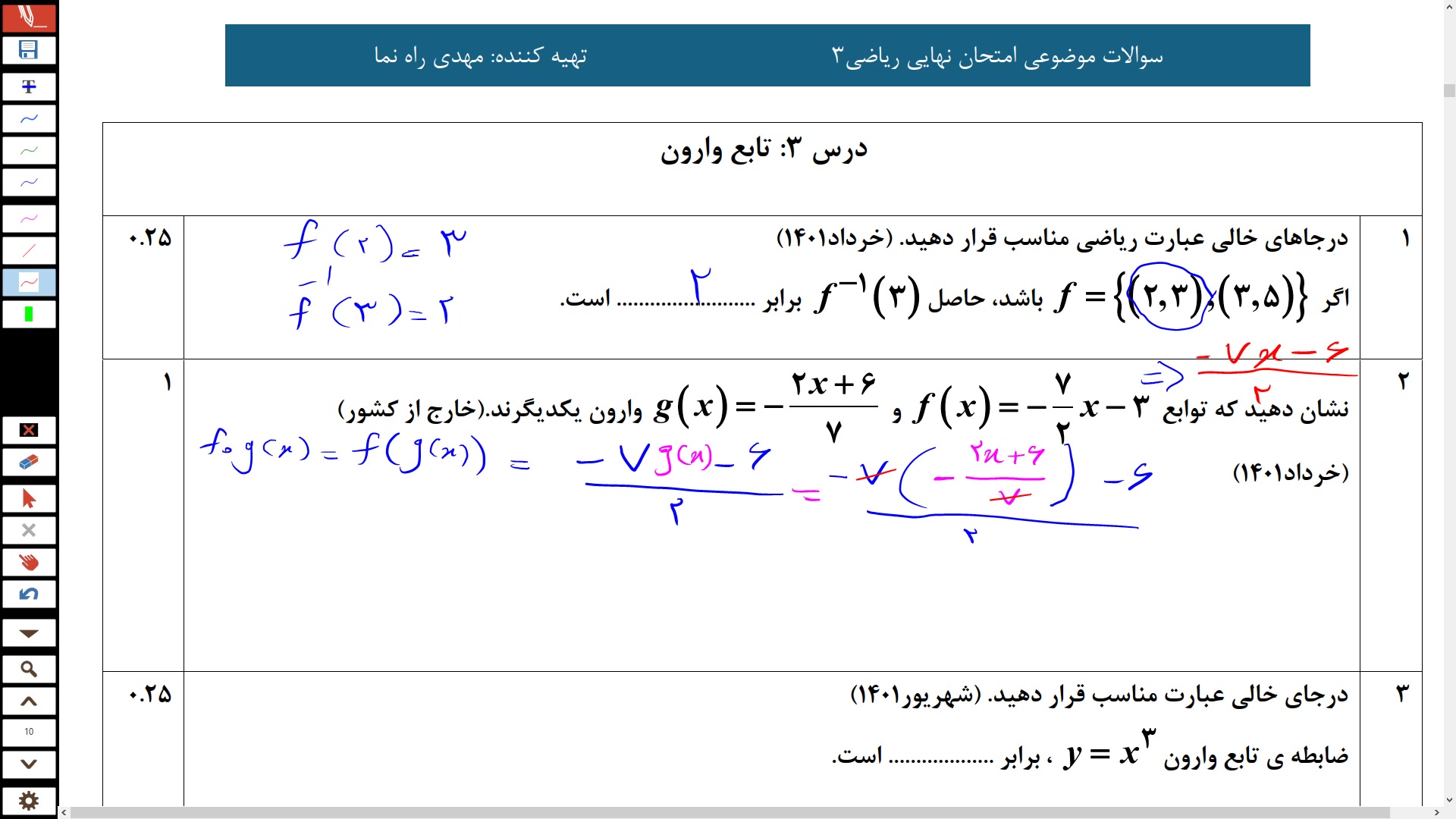 حل سوالات مهم امتحان نهایی ریاضی۳ دوازدهم تجربی مبحث تابع وارون