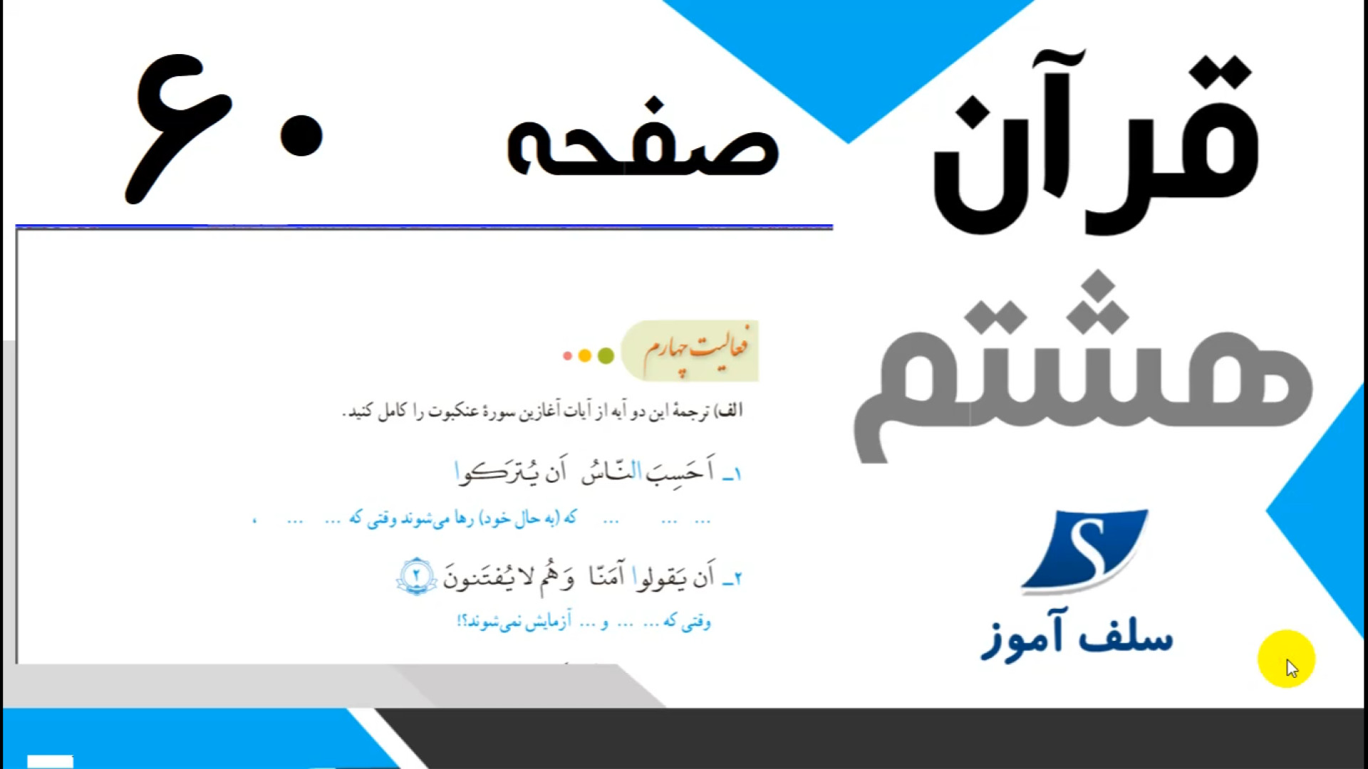 آموزش قرآن هشتم صفحه 60 ، فعالیت چهارم ، پیام قرآنی و خانه های نورانی ، براتون آماده شد ، سعی کردم تا تلفظ صحیح کلمات و توضیحات مفید برای وقف و اتصالات بگم، تمرینها رو هم حل کردم