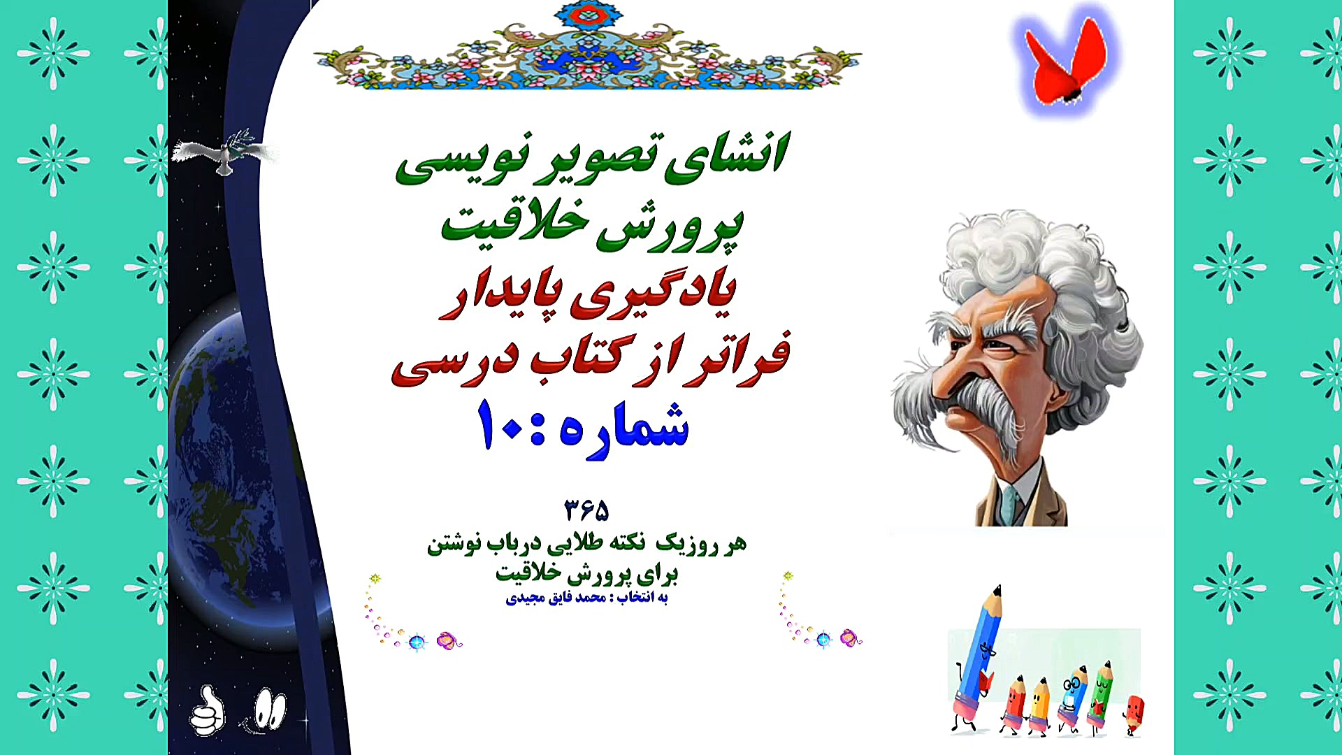 انشای تصویر نویسی پرورش خلاقیت یادگیری پایدار فراتر از کتاب درسی شماره :10 365 هر روزیک نکته طلایی درباب نوشتن برای پرورش خلاقیت به انتخاب : محمد فایق مجیدی