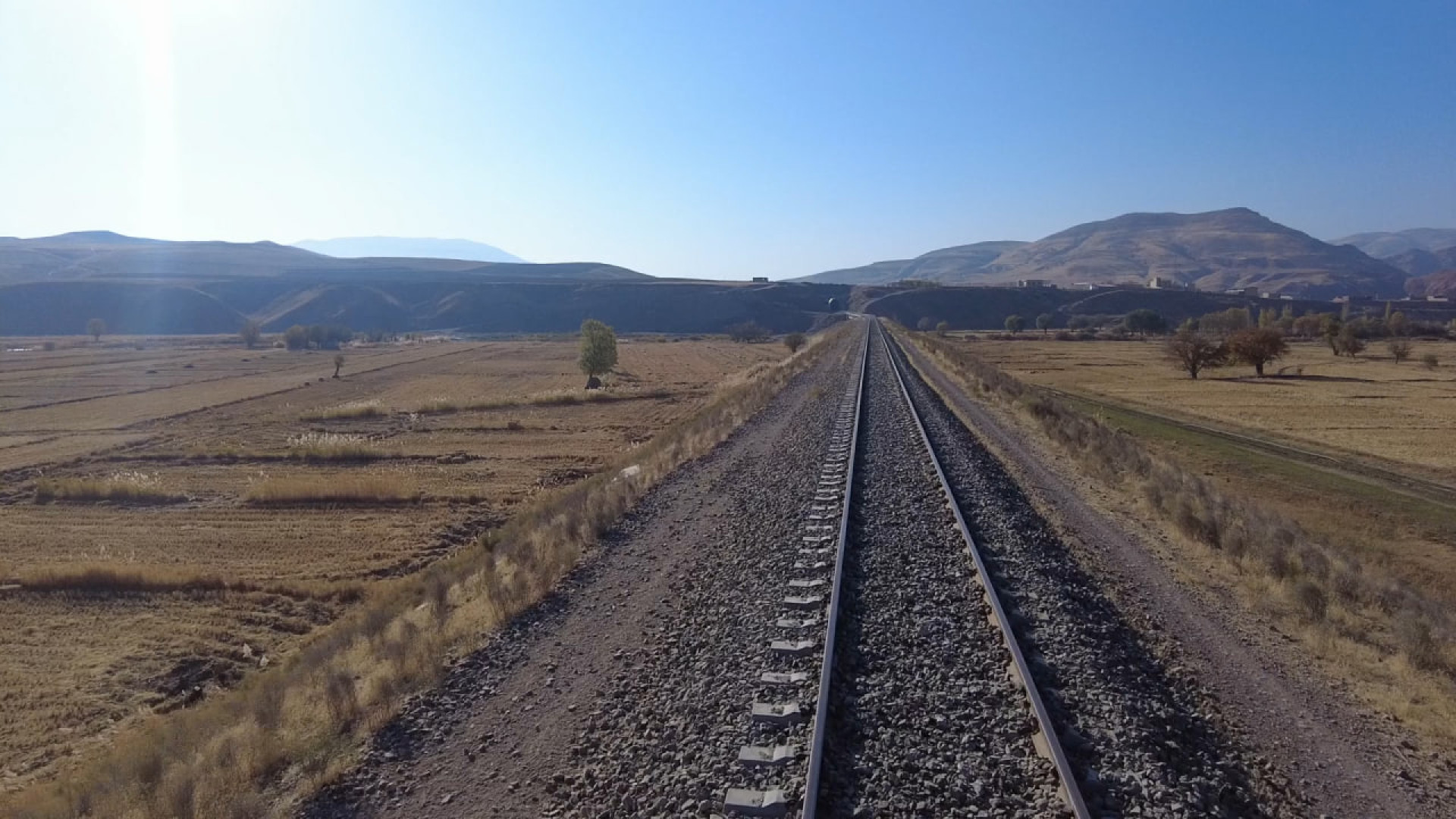 فوتیج حرکت قطار روی ریل از زاویه داخل و کوهها در عمق میدان