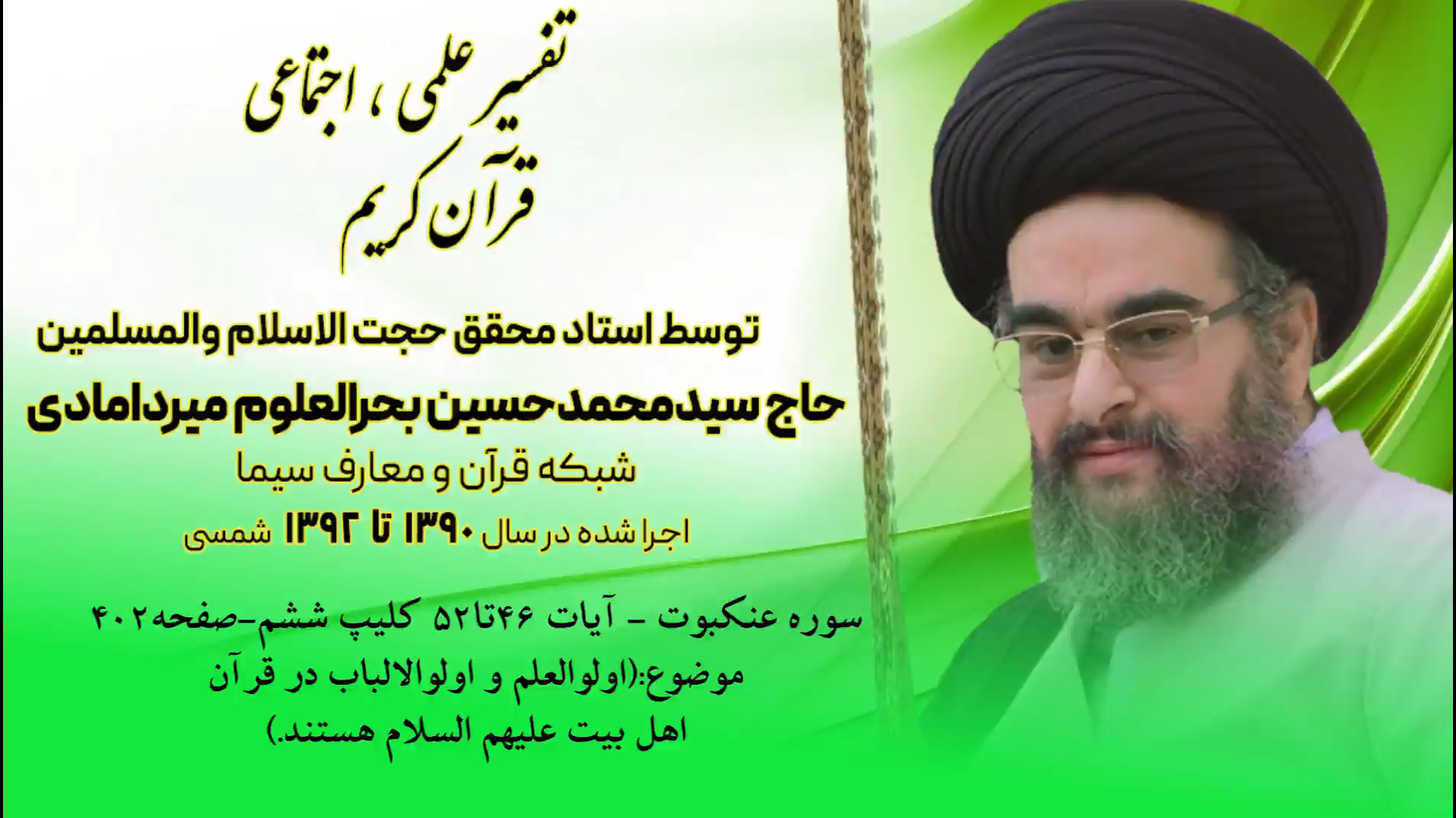 کلیپ ششم صفحه 402 اولوالعلم و اولوالالباب در قرآن اهل بیت علیهم السلام هستند به بیان استاد محقق حجت الاسلام والمسلمین حاج سید محمد حسین بحرالعلوم میردامادی پخش در شبکه قرآن ومعارف سیما در سال1390تا1392