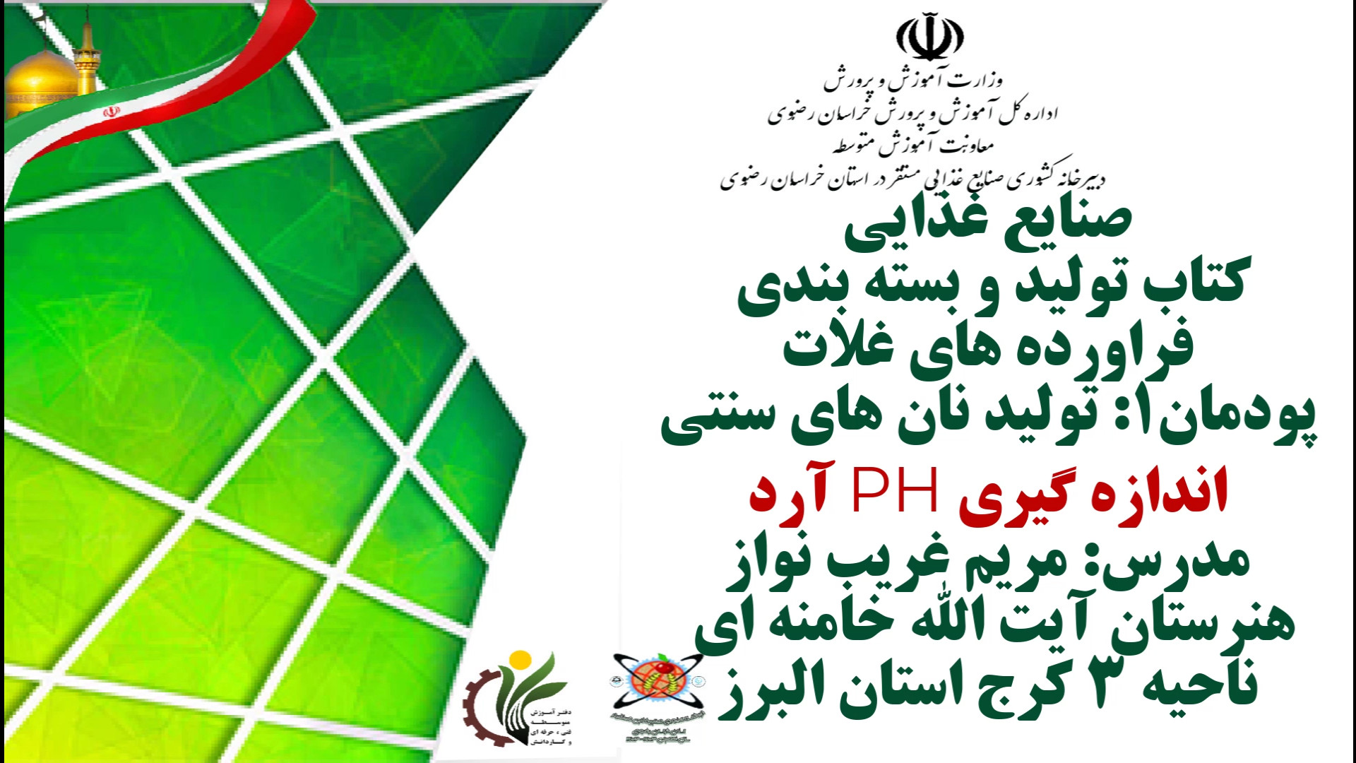 صنایع غذایی کتاب تولید و بسته بندی فراورده های غلات پودمان1: تولید نان های سنتی اندازه گیری PH آرد مدرس: مریم غریب نواز هنرستان آیت الله خامنه ای ناحیه 3 کرج استان البرز