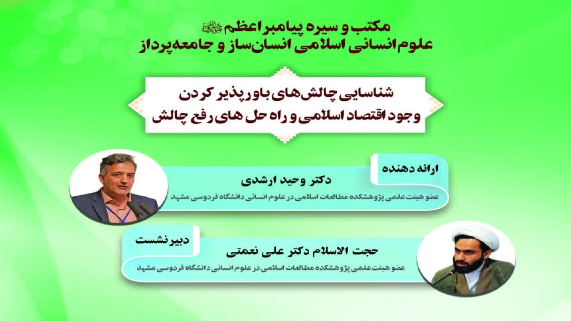 ارائه کننده: - دکتر وحید ارشدی، عضو هیأت علمی پژوهشکده مطالعات اسلامی در علوم انسانی دانشگاه فردوسی مشهد - حجت الاسلام دکتر علی نعمتی، عضو هیأت علمی پژوهشکده مطالعات اسلامی در علوم انسانی دانشگاه فردوسی مشهد از سلسله نشستهای علمی همایش "مکتب و سیره پیامبر اعظم (ص) علوم انسانی اسلامی انسان ساز و جامعه پرداز"، به مناسبت هزار و پانصدمین سال میلاد پیامبر اکرم (ص)