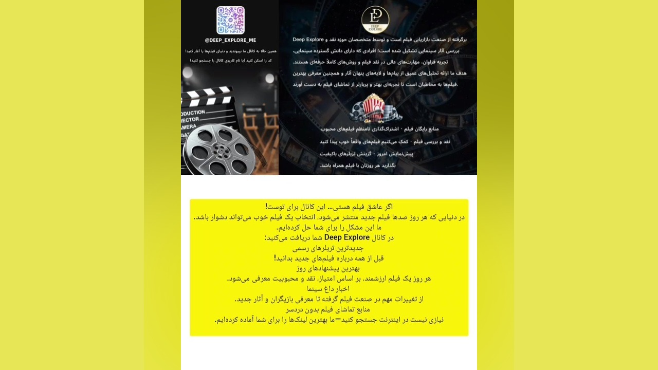 اگر عاشق فیلم هستید... این کانال برای شماست! ما شما را پوشش میدهیم. در کانال "Deep Explore"، موارد زیر را دریافت خواهید کرد: آخرین تریلرهای رسمی به ما بپیوندید و از لذت فیلم دو چندان لذت ببرید! لینک کانال: https://t.me/Deep_Explore_me