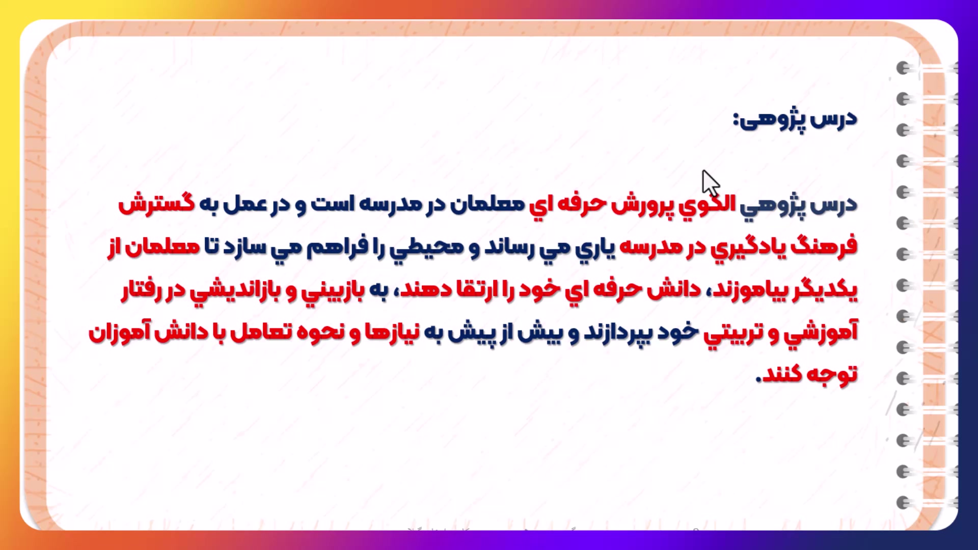 درس پژوهی بازدید : 5 0 لایک گروه ریاضی متوسطه دوم استان گیلان منتشر شده در تاریخ 05 دی 1404 15:02 وبینار برگزارشده در تاریخ 9 آذر 1404 مدرس: مهدی خرم دل ادامه تحصیلات و یادگیری