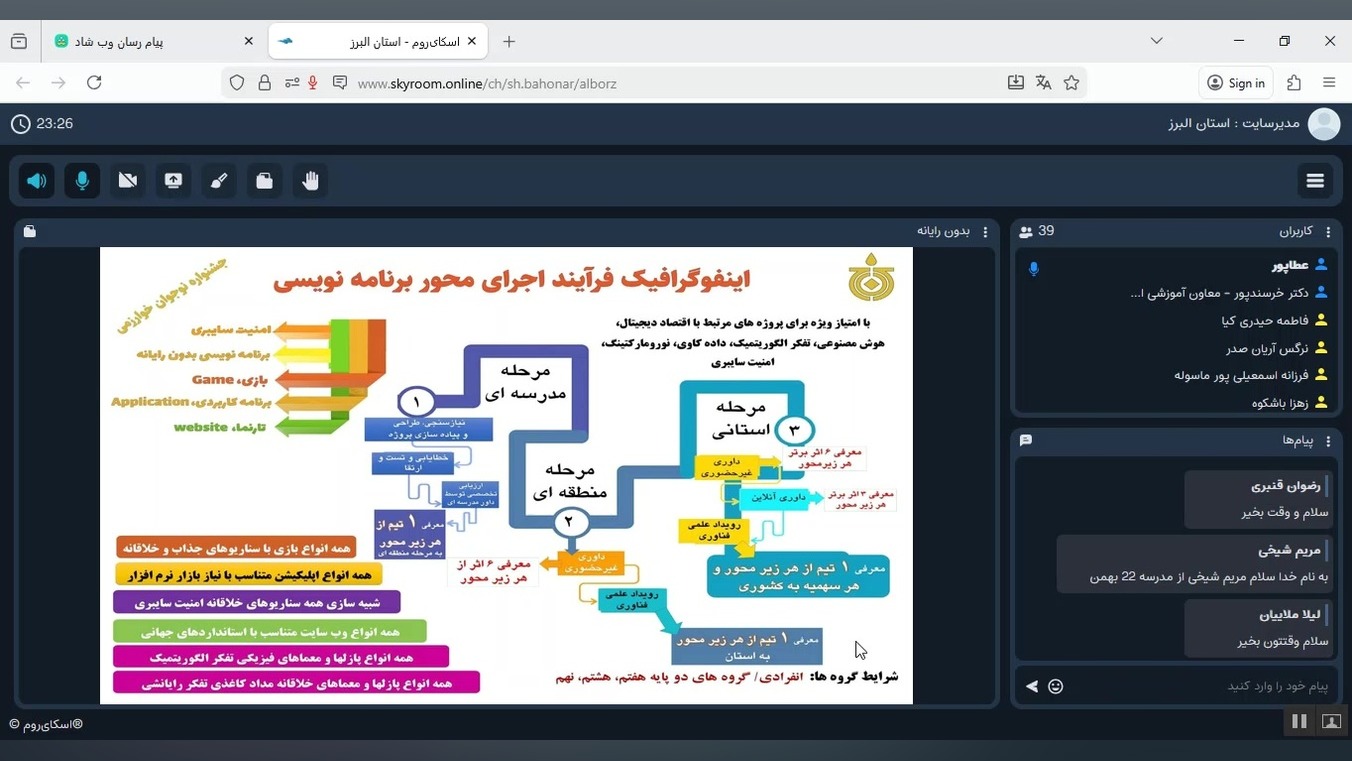 وبینار تبیین شیوه نامه محور برنامه نویسی و هوش مصنوعی دوازدهمین دوره جشنواره نوجوان خوارزمی در زیرمحور برنامه نویسی بدون رایانه در استان البرز توسط آقای دکتر حامد فرهادی ، مهندس سیدمحمدعطاپورفرد و خانم مهندس باشکوه