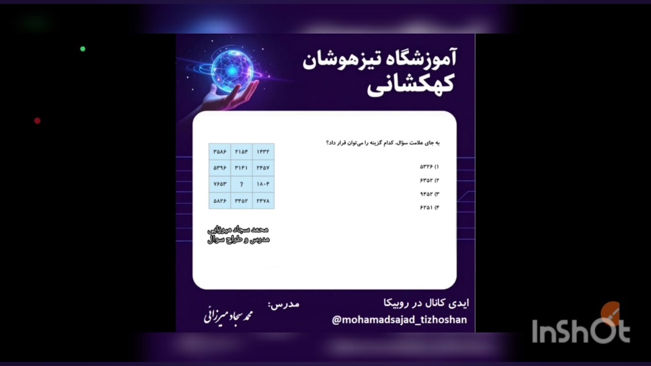 حل سوال هوش تیزهوشان محمد سجاد میرزایی تیزهوشان میاد امسال بازدید : 3 1 لایک محمد سجاد تیزهوشان منتشر شده در تاریخ 05 دی 1404 21:55 کانال روبیکا تیزهوشان @Mohamadsajad_tizhoshan ادامه تحصیلات و یادگیری