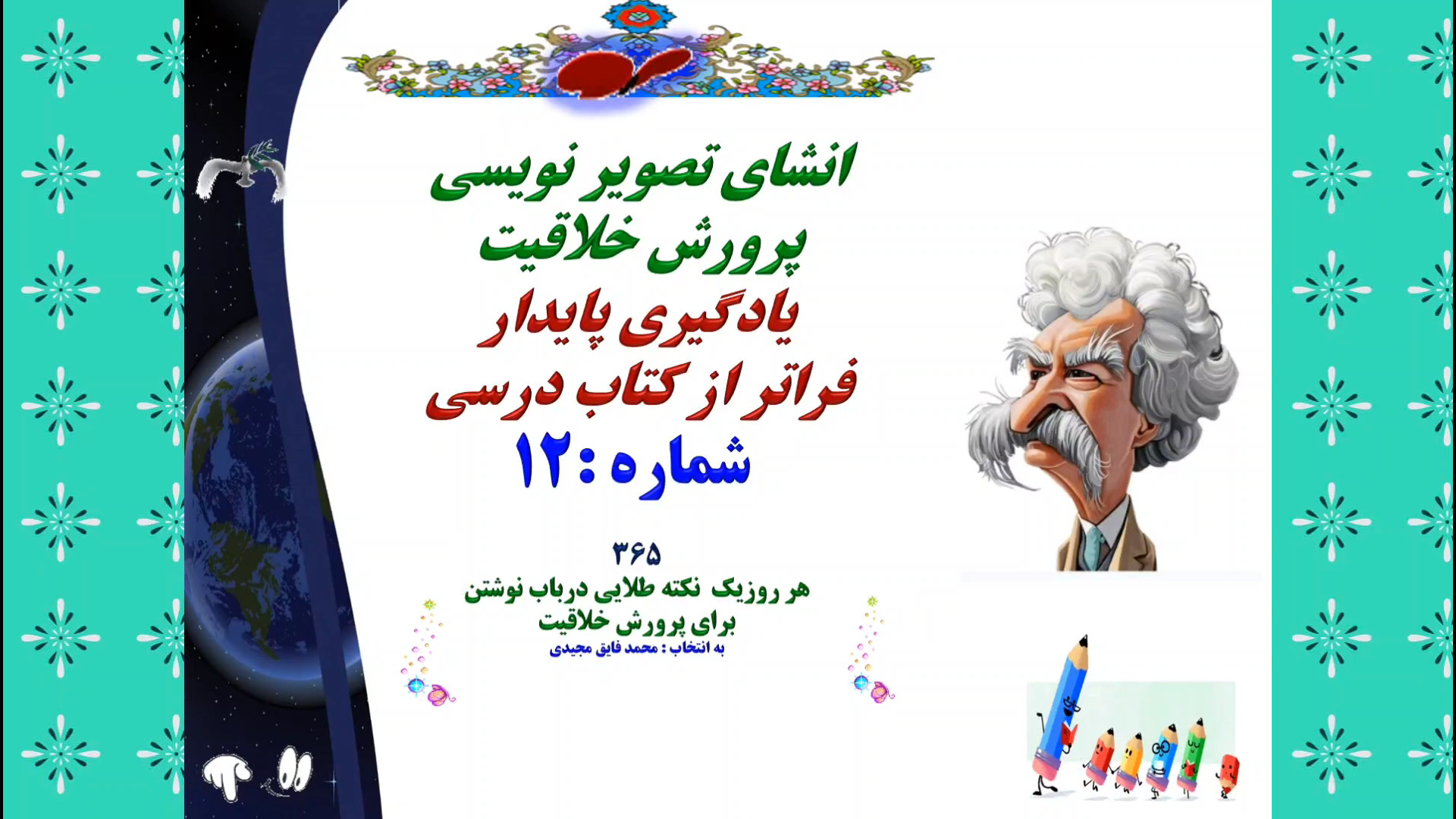 انشای تصویر نویسی پرورش خلاقیت یادگیری پایدار فراتر از کتاب درسی شماره :12 365 هر روزیک نکته طلایی درباب نوشتن برای پرورش خلاقیت به انتخاب : محمد فایق مجیدی