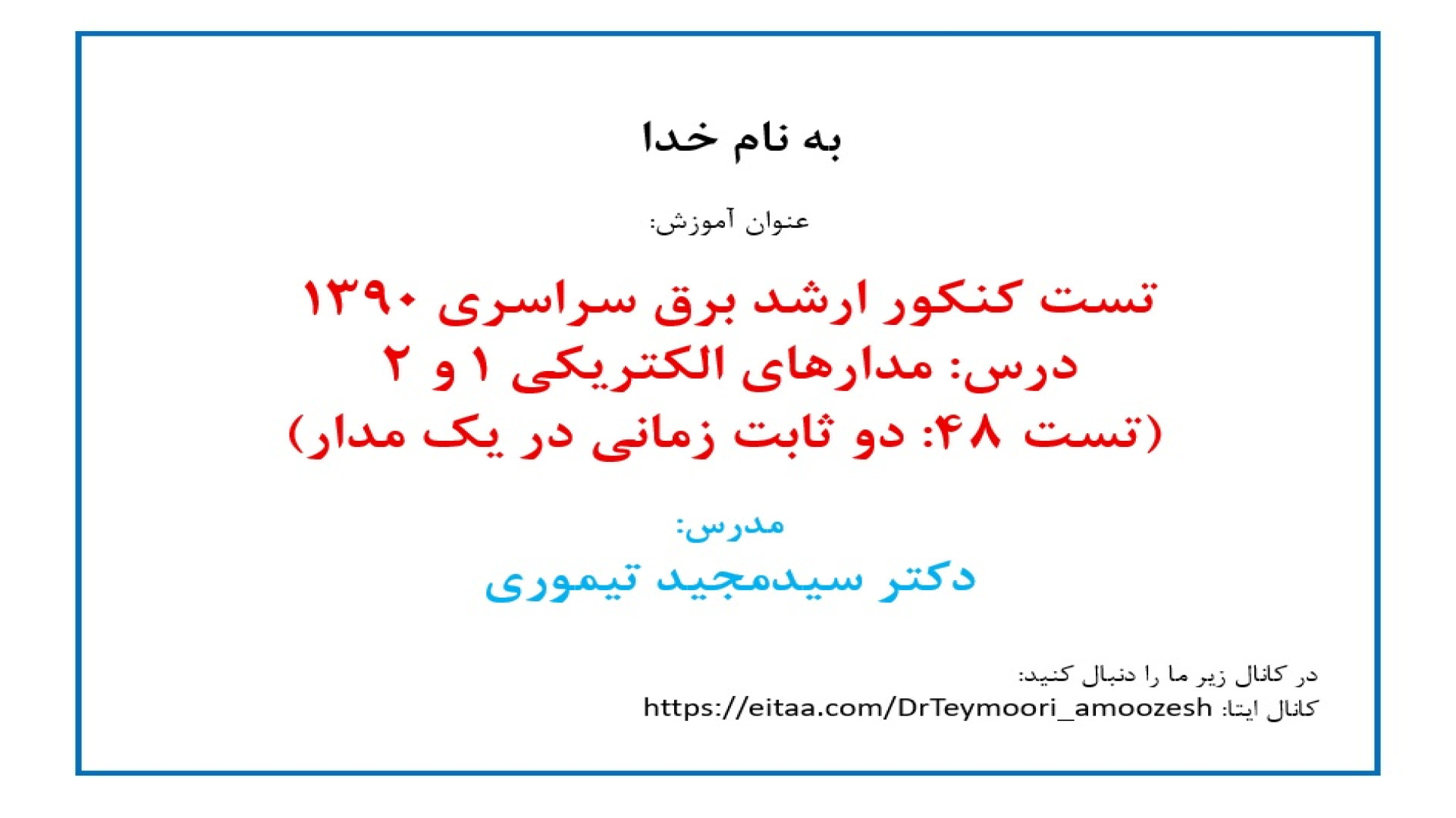 در این ویدیو، دو ثابت زمانی در یک مدار بررسی شده و تست 48 کنکور ارشد برق 1390 پاسخ داده میشود. ما را در کانالهای زیر دنبال کنید: https://www.aparat.com/mirmajid1977 https://eitaa.com/DrTeymoori_amoozesh کامنت و لایک فراموش نشه کانال ما رو دنبال کنید تا از ویدیوهای جدید مطلع شوید.
