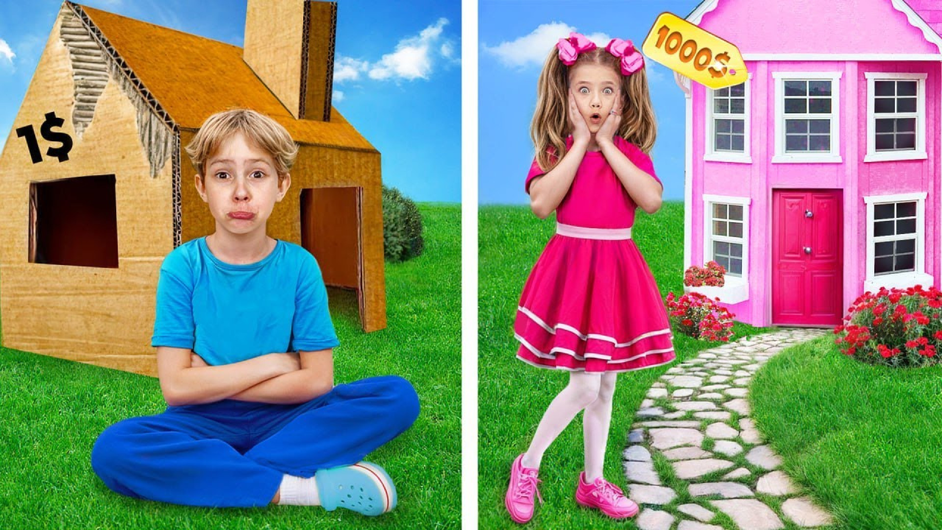 تحدي بيت الكرتون العملاق بين الاميرة الغنية والفقيرة أطفال يلعبون التحديات باستخدام الورق المقوى ويتظاهرون باللعب مع الأميرة الغنية مقابل الأميرة الفقيرة