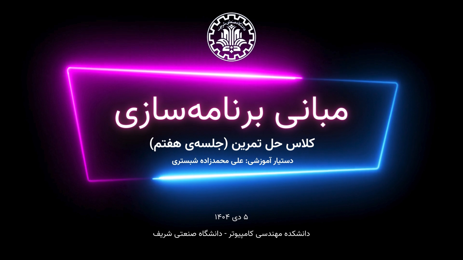 جلسهی هفتم حل تمرین — مبانی برنامهسازی (پایتون) تاریخ برگزاری: ۵ دی 1404 دستیار آموزشی: آقای علی محمدزاده شبستری (دانشجوی مهندسی کامپیوتر دانشگاه صنعتی شریف) در این جلسه مدلسازی منظومهی شمسی و حرکت سیارات برای دانشجویان فیزیک و سایر مهندسیها به وسیله برنامهنویسی شیگرا در پایتون انجام شد. سرفصلها: - برنامهنویسی شیگرا (شیگرایی) تعریف کلاس تعریف ویژگیها (attrbiute) در یک کلاس پیادهسازی تابع init و توضیح دربارهی مقداردهی ویژگیها تعریف توابع (method) در کلاس توضیح self ساختن نمونه (object) از کلاس فراخوانی توابع روی نمونهها