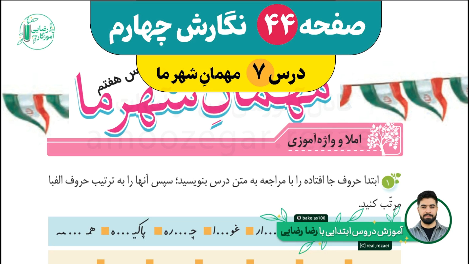صفحه 44 نگارش چهارم ابتدایی | درس 7 | مهمان شهر ما بازدید : 24267 221 لایک آموزش های رضا رضایی منتشر شده در تاریخ 05 دی 1404 11:45 کانال روبیکا: https://rubika.ir/bakelas100 ادامه تحصیلات و یادگیری