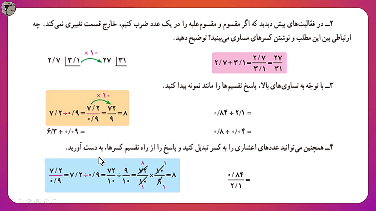 شرح و حل صفحه 58 ریاضیی ششم تقسیم اعشاری با روش کسر بازدید : 35 1 لایک پری ناز باقری منتشر شده در تاریخ 05 دی 1404 19:20 ریاضی ششم,صفحه 58,تقسیم اعشار,جواب توضیح,روش کسری ادامه تحصیلات و یادگیری