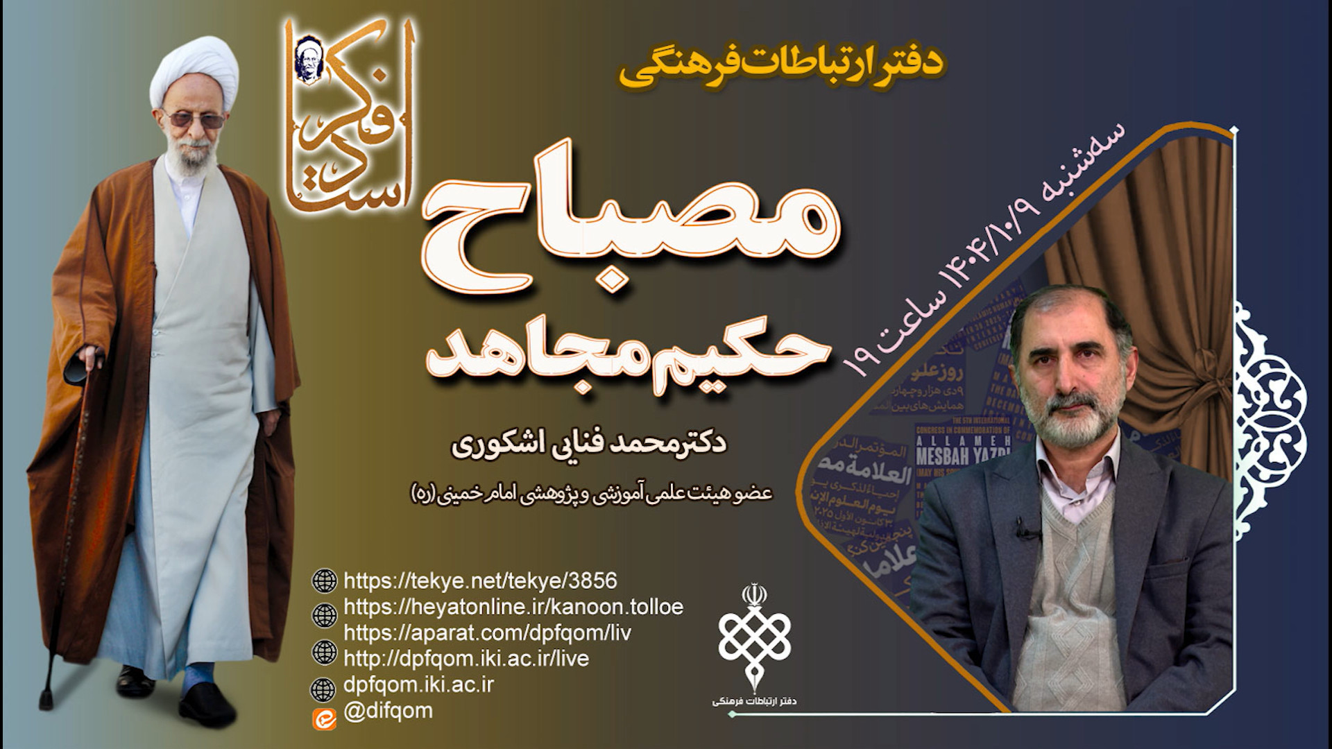 سلسله برنامههای تبیینی-بصیرتی دفتر ارتباطات فرهنگی ویژه: سالگرد ارتحال علامه مصباح ره موضوع: مصباح؛ حکیم مجاهد سخنران: جناب آقای دکتر محمد فنایی اشکوری