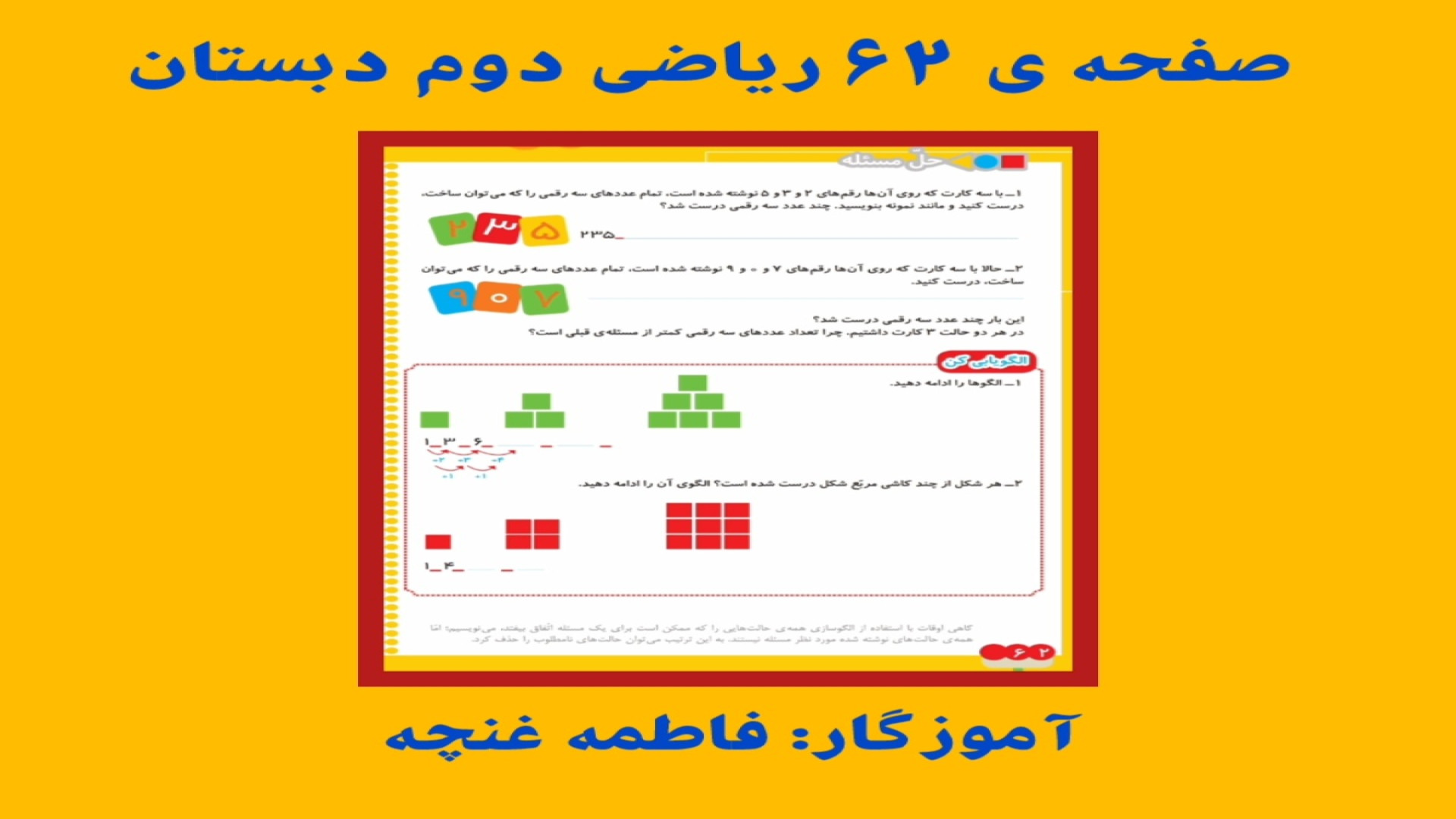آموزش صفحه ی ۶۲ ریاضی دوم دبستان بازدید : 204 4 لایک فاطمه غنچه منتشر شده در تاریخ 05 دی 1404 21:27 ریاضی دوم دبستان,الگویابی,حذف حالت های نامطلوب,ساخت عدد سه رقمی با کار,صفحه ۶۲ ریاضی ادامه تحصیلات و یادگیری