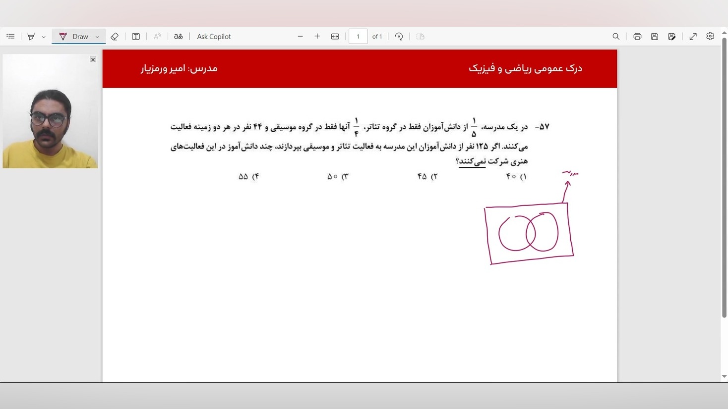 نمونه سوال نمودار ون بازدید : 5 0 لایک ریاضی کنکور هنر | ورمزیار منتشر شده در تاریخ 04 دی 1404 14:22 توی این ویدیو، یک مثال از نمودار ون حل میکنیم. ادامه تحصیلات و یادگیری